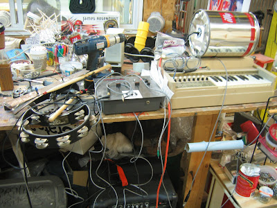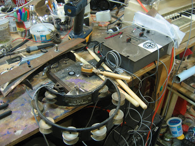 I have here my new electric tambourine, and ribbon crasher, and on top of the drum sticks is my single tambourine hand shaker(i used the lid off a frappucino bottle to secure the contact mic in place, it was a perfect fit)