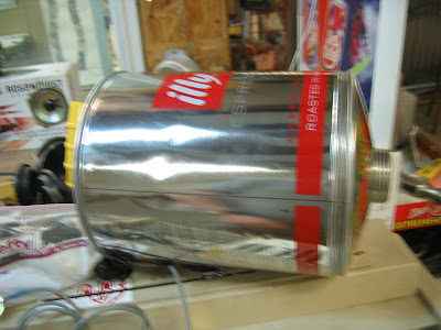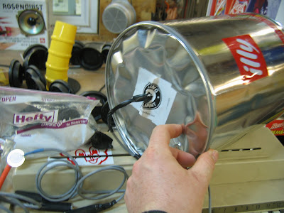 this is my old dj mixer i bought like 8 years ago,(during that whole second wave dj craze, i got it real cheap because a month after it stopped being hip this things showed in pawn shops in droves) the cross fader broke a while ago, and i just never fixed it. when i started to make the contact mics i decided this would come in handy, so i went ahead and removed the cross fader and hacked into all the channels and then made patch cables to run the signal to my bass amp…translation this makes the noise from the contact mics controllable allowing me to control the volume without standing in front of the amp.i found this giant illy coffee bean container in the recycling bin behind a coffee shop, and i was using it as a hand drum in the studio but it was too quiet, so it became the first contact mic enabled instrument in the studio, it has a great sound somewhere between a djembe drum and a bucket.