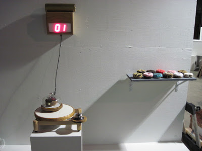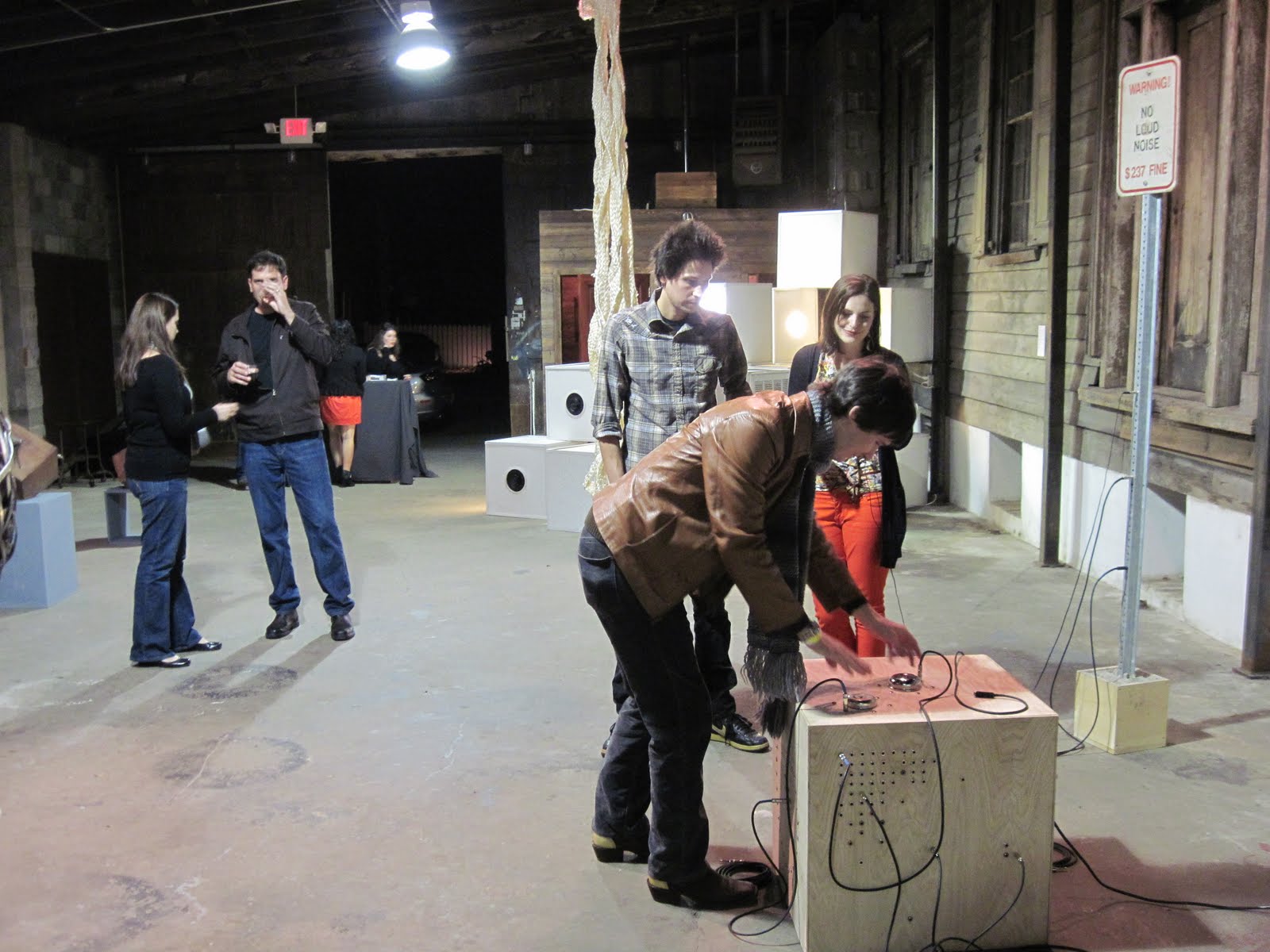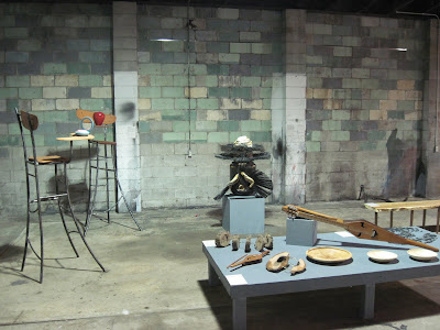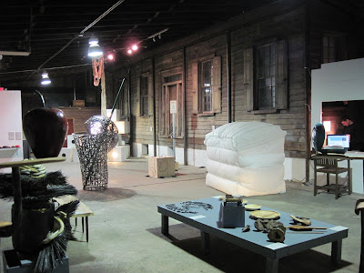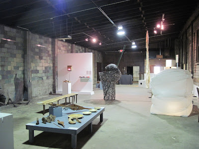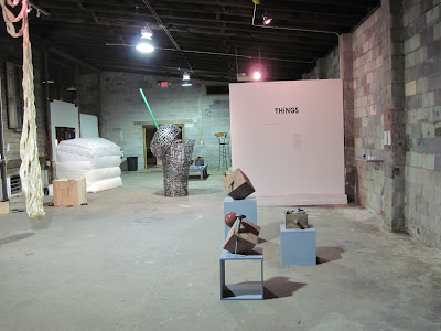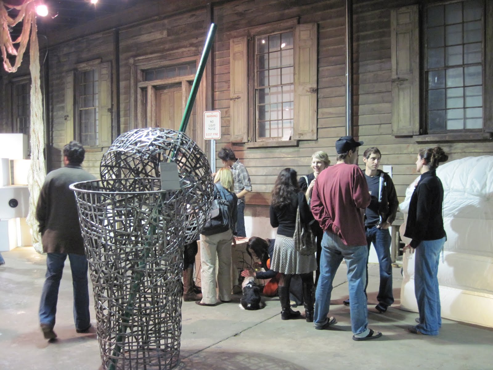 It was a tremendous honor and a huge learning curve to get to curate this show. Most of the hard work was done about six months ago when we nailed down a date when i would be free to install the show. This show was sort of like my off time between the berlin stop of the Have Sticks Will Travel World Tour and the beginning of the install at The McMaster Gallery at The University of South Carolina. The goal for this show was to use the space as a way to highlight a disparate but related arrangement of objects. I had envisioned being able to use the work of the other artists in concert with each other and the 103 spring gallery to create an overall sense of one cohesive installation. Throughout this process I think I learned that my approach and vision for curating, is to utilize other artists work to create a site responsive installation. I did have many limitations, not least of which was a non-existent budget for shipping, and my relentless installation and travel schedule for my personal work. None the less my west coast artists managed to come up with elegant solutions to this problem by creating work that was shippable in small packages but could take ownership of the space provided. I was equally surprised by the local artists, who when asked for specific types of work often times surpassed their previous work. In a couple cases I was completely unfamiliar with the artists work but their descriptions of what they were planning were enough to re-assure me that I would be able to create the installation I was imagining. The end result is that I’ve got a show which has a little weaving, a little welding, a little stacking, a little arranging, some found objects, a couple cubes, and a nice mix of work with the artist “hand” at the forefront and a lack of the artist “hand”(something i strive in my personal work as well). I had solicited cube or cube related work from 4 of the artists and was very happy to still see that vision carried through for the first passage of the show, then in the next section the show transitions into a still life/archaeological arrangement area. This flow was a response to the shear beauty of the 103 spring space. Inside the space is the facade of an 1830’s era house which the former car garage was built around. Opposite the facade is this amazing wall of many colors. This lived in post-industrial space with the ghost of a former home was already a tremendous work of art in it’s own right. I knew that any object I added to the space would immediately begin to dialog with this space. I hope the viewer has a chance to experience the show in the relative isolation that I was afforded as the curator/preparator/exhibition designer. It was a nice “break” from my work and still kept the part of my mind that is interested in shaping and engaging architectual spaces active. I am looking forward to my next challenge in Early December when i begin installing “Sticks, Straws, Sleeves and Lids” My new installation for the University of South Carolina which opens January 15th.