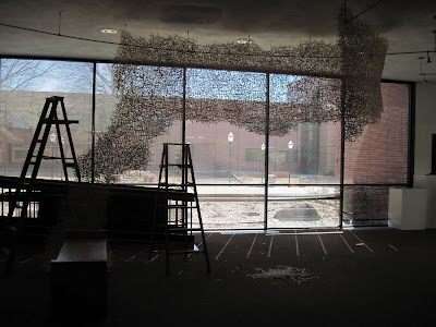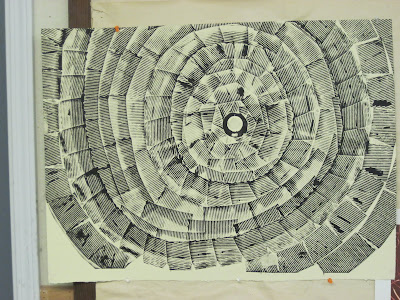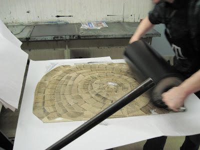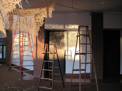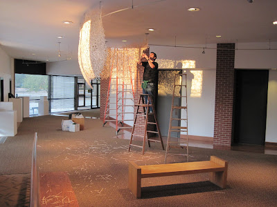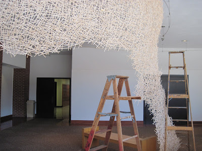 Today I did my first split day, weaving in the obu gallery in the morning, and printing at henderson state in the afternoon, and boy are my arms tired, thanks to master printmaker davdid warren and super print assistant brittany.Tomorrow I will be spending the day weaving in the gallery beginning to resolve the form and further integrate the bench into the installation. On Monday I will resume work on some of the prints in addition to the coffee cup sleeve collagraph, the screenprint, and the lithograph, we will be making some new lid relief prints, and maybe some other works as well.