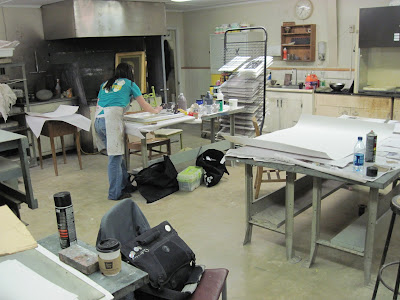 here’s the litho stone in progress for one of the prints I am working on at Henderson State, below is super student Brittany proofing the first of six colors for a screenprint.