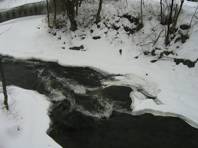 it’s hard to tell but the river is slowly freezing over and becoming a stream eventually it will be solid all the way across.