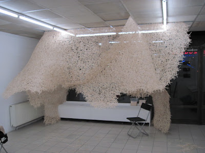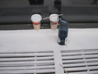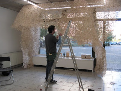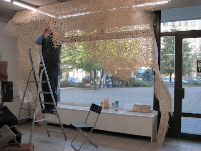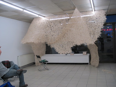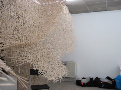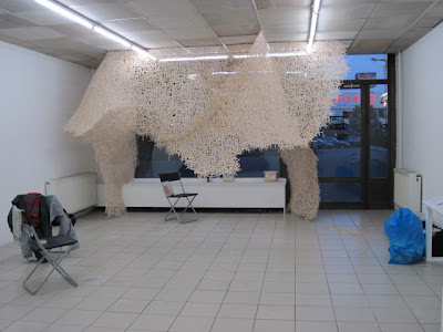 judging by the spent latte’s up in this piece it must be the end of day two.the legs in the corner belong to paul middendorf the co-mastermind along with leah stuhltrager behind the east/west project that is hosting this installation.
