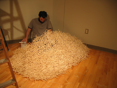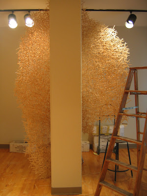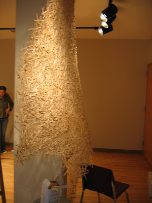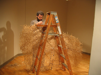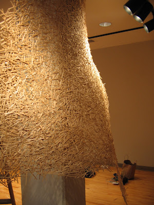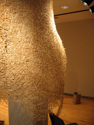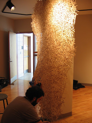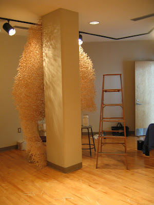 there is also some video of the work she did “assisting” me with the install( but i figured no one wants to see 3 minutes of a sleeping woman and a weaving man). I think tomorrow she is going to sleep in while i go work. after tomorrow i should be able to catch a ride in each morning with the faculty who work at scsu and live in columbia.by the time we left the form was starting to take shape around the column. tomorrow i will focus on the main curve around the column and hopefully begin defining the shape a bit more.