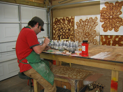 so this is my production painting area, formerly the rust print table, it is the same one i built i last summer when i was working outside on the rust prints,and it has served me well