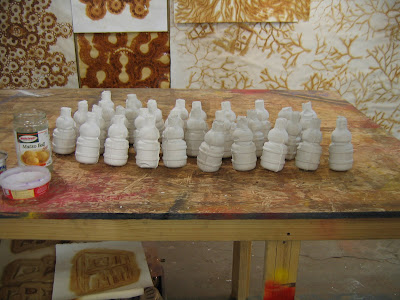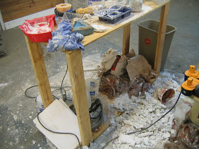 so i got in such a production routine that it got uncomfortable to be working on the floor, so i built a standing level casting station, and as you see in front of it my collection of plaster debris is growing. Secretly I am just as excited about the plaster debris and chip offs from the molds as i am about the castings being produced.