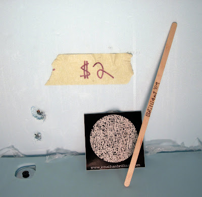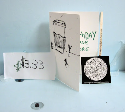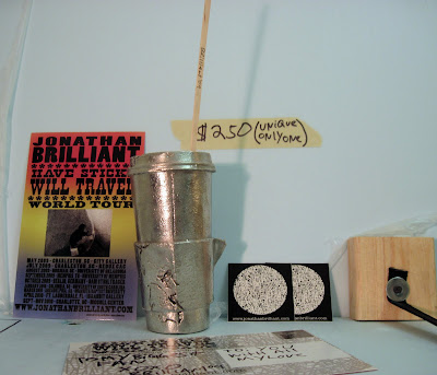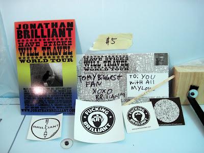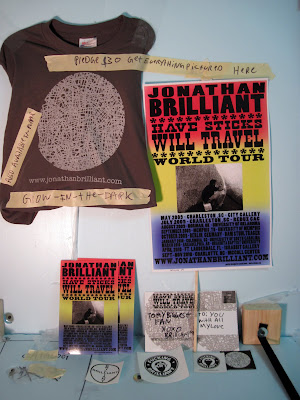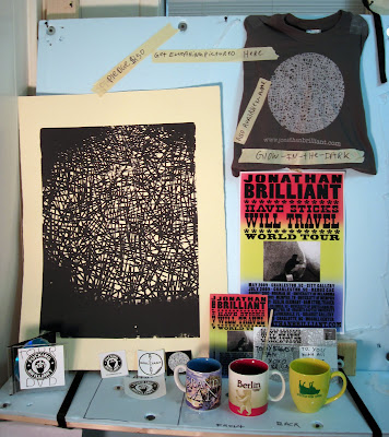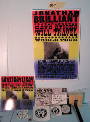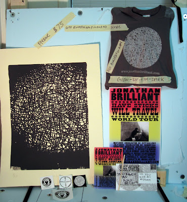 a very special stir stick embossing monoprint(created by inking and running the actual woven stir sticks through a printing press) plus A one color screenprint emblazoned with the woven stick pattern plus A glow in the dark Jonathanbrilliant.com t shirt and A selection of jonathnbrilliant.com stickers, official tour poster(designed by Sarah Lowe), and a couple postcards