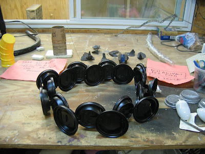 these are some nifty new coffee cup lids i liberated from a gas station in Tennessee. I really think they would make a great large scale public playground piece. the lids have a built in flap that makes a perfect connective system for chaining them together with other lids