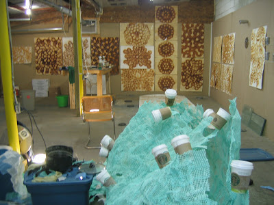 so I have been letting the plastic piece slowly consume my coffee cup collection and in the background i have been reorganizing the rust prints to create new groupings for future shows.