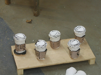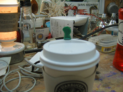 in this picture i am holding another one of starbucks new toys, which i want everyone to get and send me more of, it is a special plastic stir stick that also plugs the drink hole in the sippy lid. It is really weird because it has a stylized mermaid as the top most element of it. I also worked on some logo re-designs of my own and when i get them cleaned up and ready i will load them up here the day before starbucks released their re-designs i had already painted these plaster coffee cups based on the color scheme of the old cup. So i immediately began work on a new cycle of coffee cup inspired pieces and drawings based on the new logo.