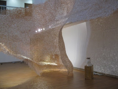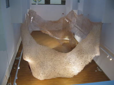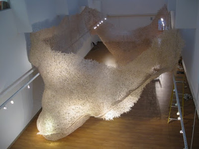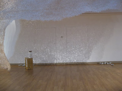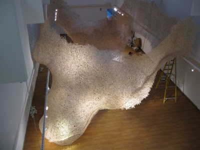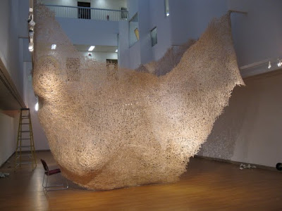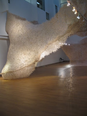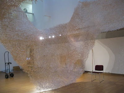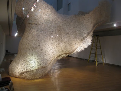 Well I finished working on the norman piece this morning. I spent the day working on and then giving my artist talk, and just sort of hanging out around the ou art building. Tomorrow I am going to try and get in the print shop and pull some prints before the opening. I still need to clean up the debris and try and get a good nights sleep before tomorrow but otherwise things are well. I think one of the biggest things I found out with the norman piece is that it felt like I had taken what I made for the city gallery piece and split it in half. Where the past three stir stick installations had central forms that defined them, the norman piece feels more like a return to my interest in defining space the way the redux piece did in 2006. I also discovered the joy pf creating the intersecting planes that appear on one end of the piece. The intersecting planes felt a bit like I was finally letting out my inner maya lin. I will try my best to get some action shots during the opening tomorrow night, and look forward to getting some time back in the studio at home before heading off to The University of Memphis for the next stop on the tour.