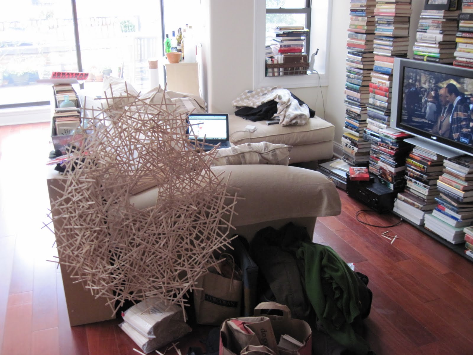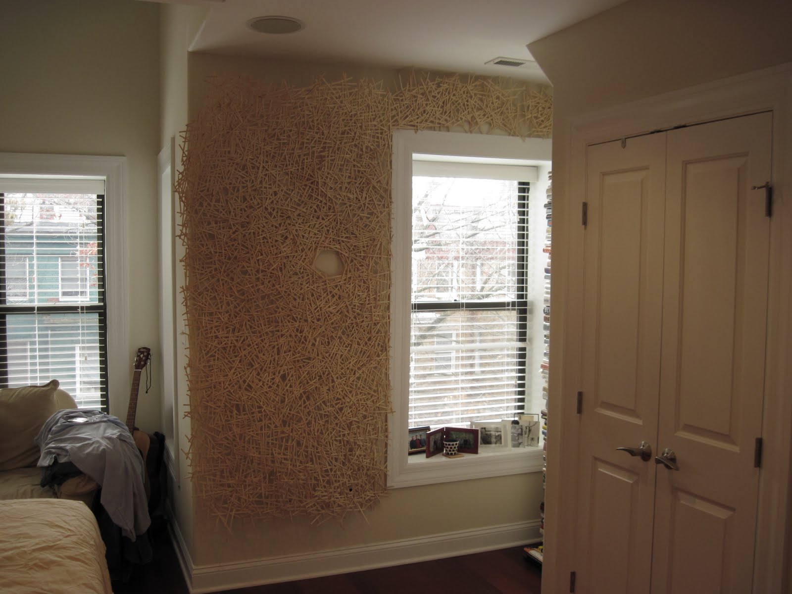 Up next I need to finish mounting a triptych of drawings for a group show that opens this week at plum elements in charleston, then I begin preparing for Sticks, Straws Sleeves and Lids which opens January 15th at The university of South Carolina. In between that I also need to figure out the final logistics for the stir stick piece for Eternal Return at Nurtureart in Brooklyn(a curated group show i have agreed to do a woven stir stick piece for). I am mostly focused on the USC show right now as it will be the first time in a couple of years that I will have enough time to present my expanded vision of what an installation drawn entirely from the detritus of the coffee shop and my ideas about british and southern sculpture. Plus it might be only the second time in working this way that throughout the duration of the install i will be sleeping in my own bed and won’t need to travel more than ten minutes between studio and site. below are some process shots of the install in the apartment and an image of the print that the piece will accompany.