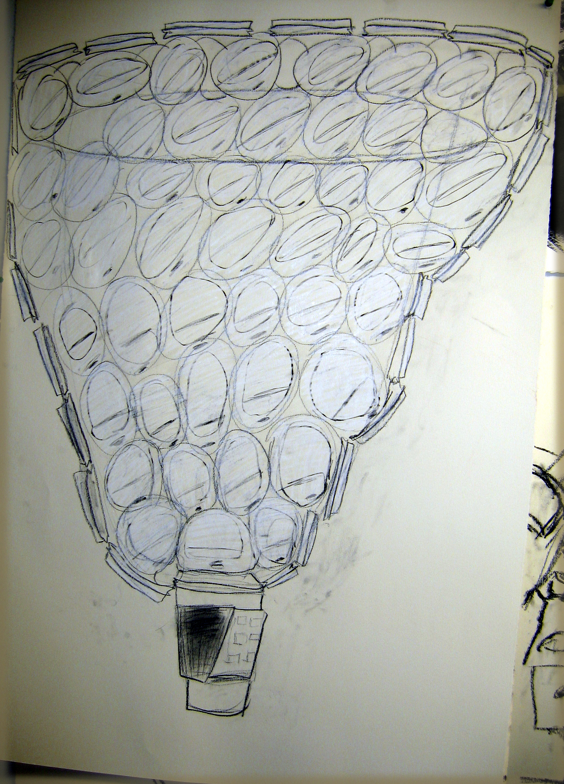 "lids with cup", charcoal and colored pencil on paper, 28"x40", 2005