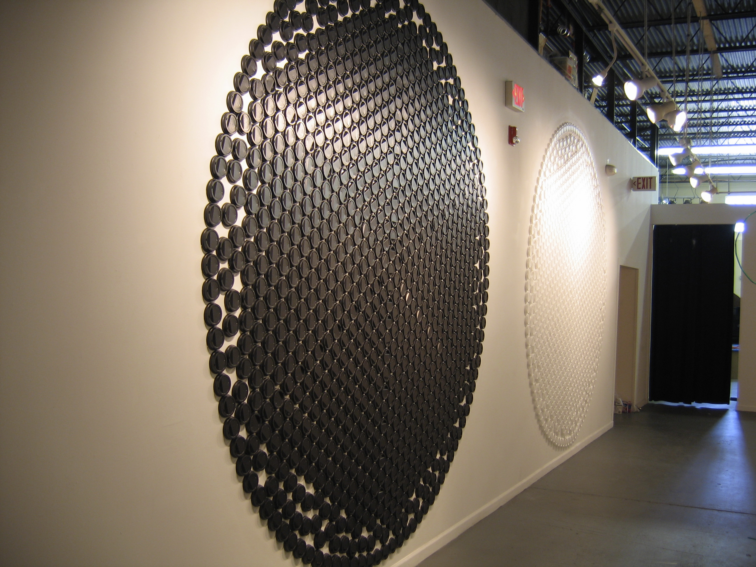 1000 black lids and 1000 white lids arranged in 10' diameter circles, 2006