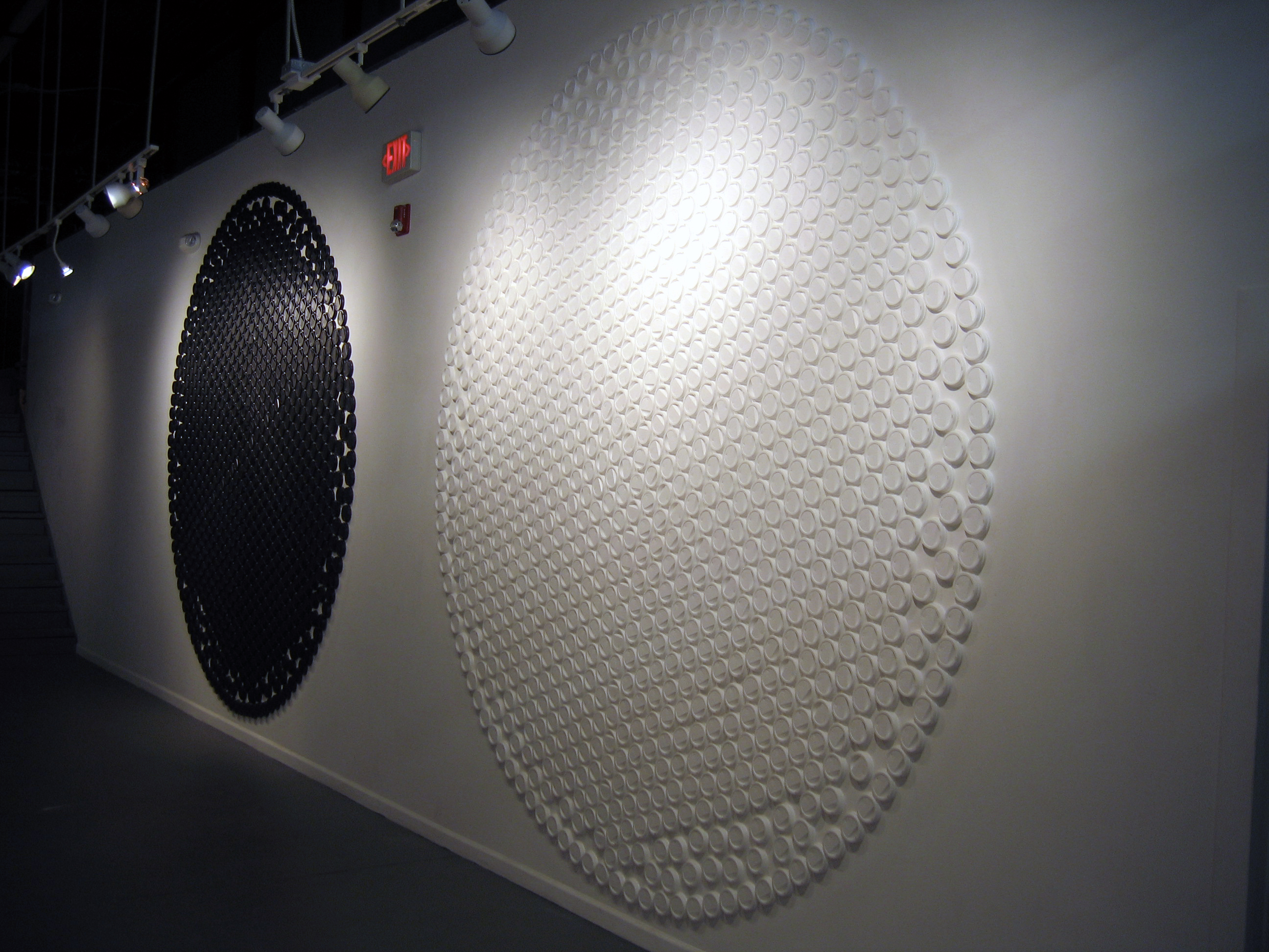 1000 black coffee cup lids and a1000 white coffee cup lids arranged on the wall in a 10' diameter circle, 2006