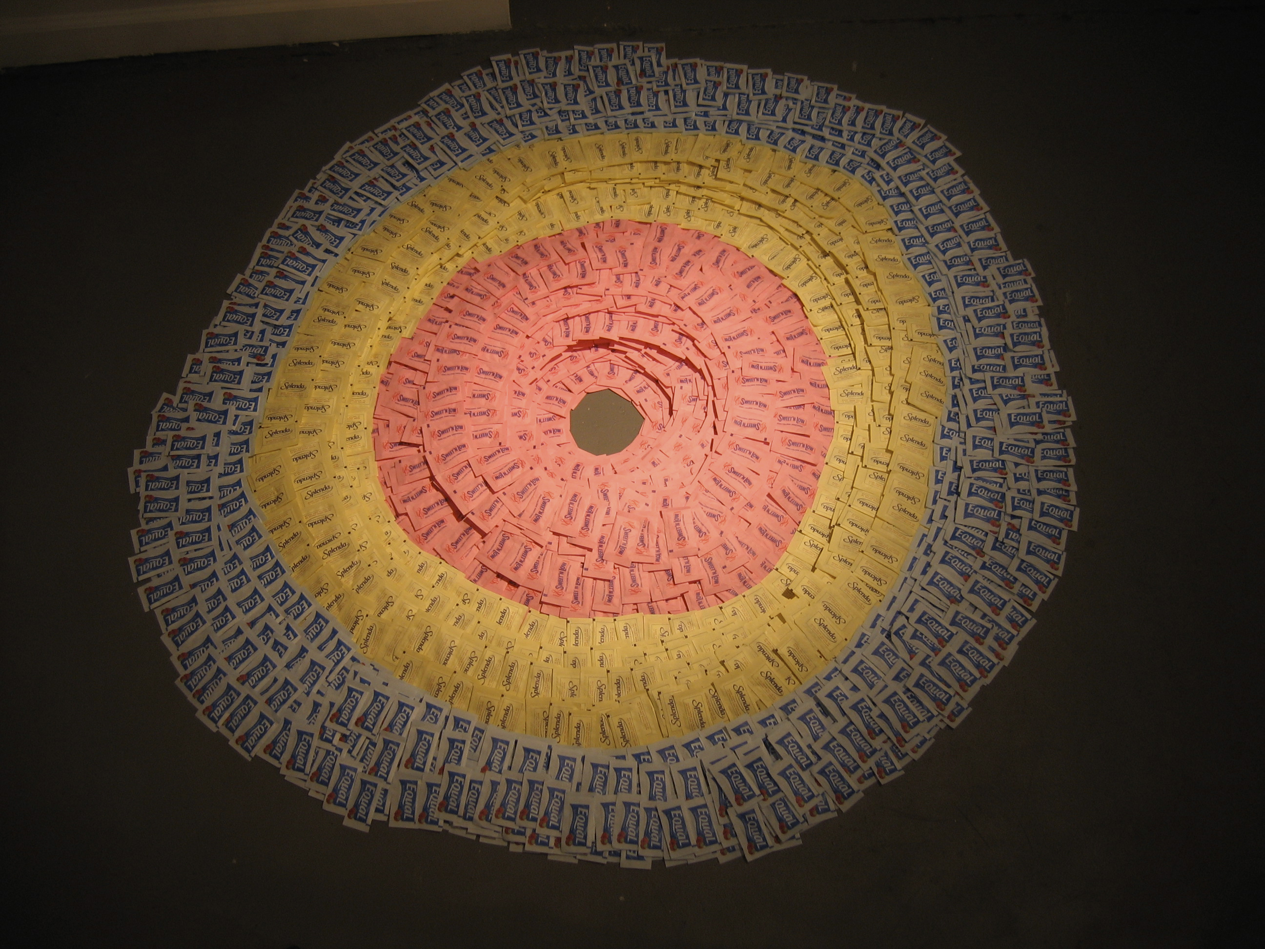 5,000sweetener packets are arranged on the floor according to color, 48" diameter, 2006