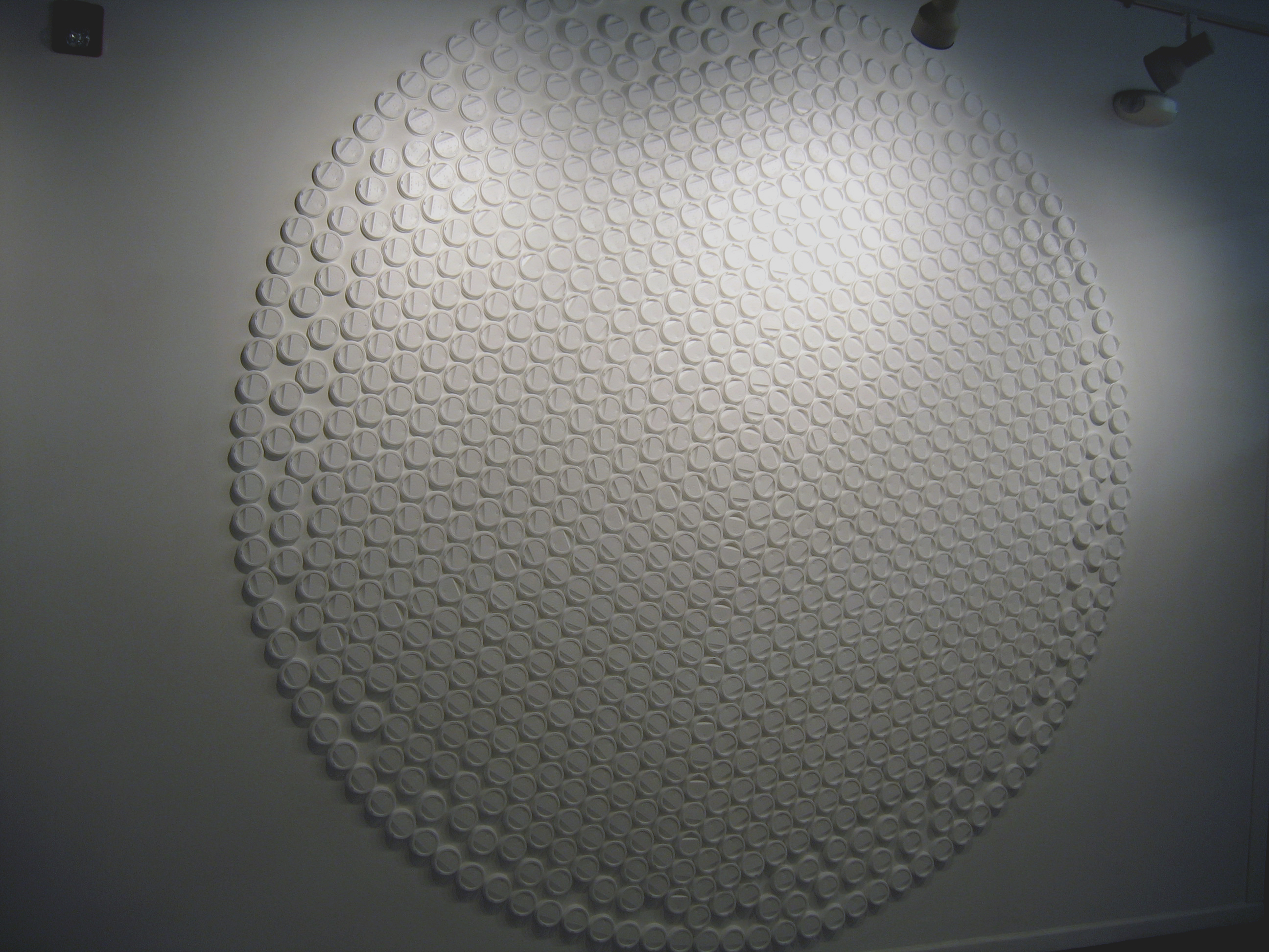 1000 white coffee cup lids arranged in a 10' diameter circle on the wall