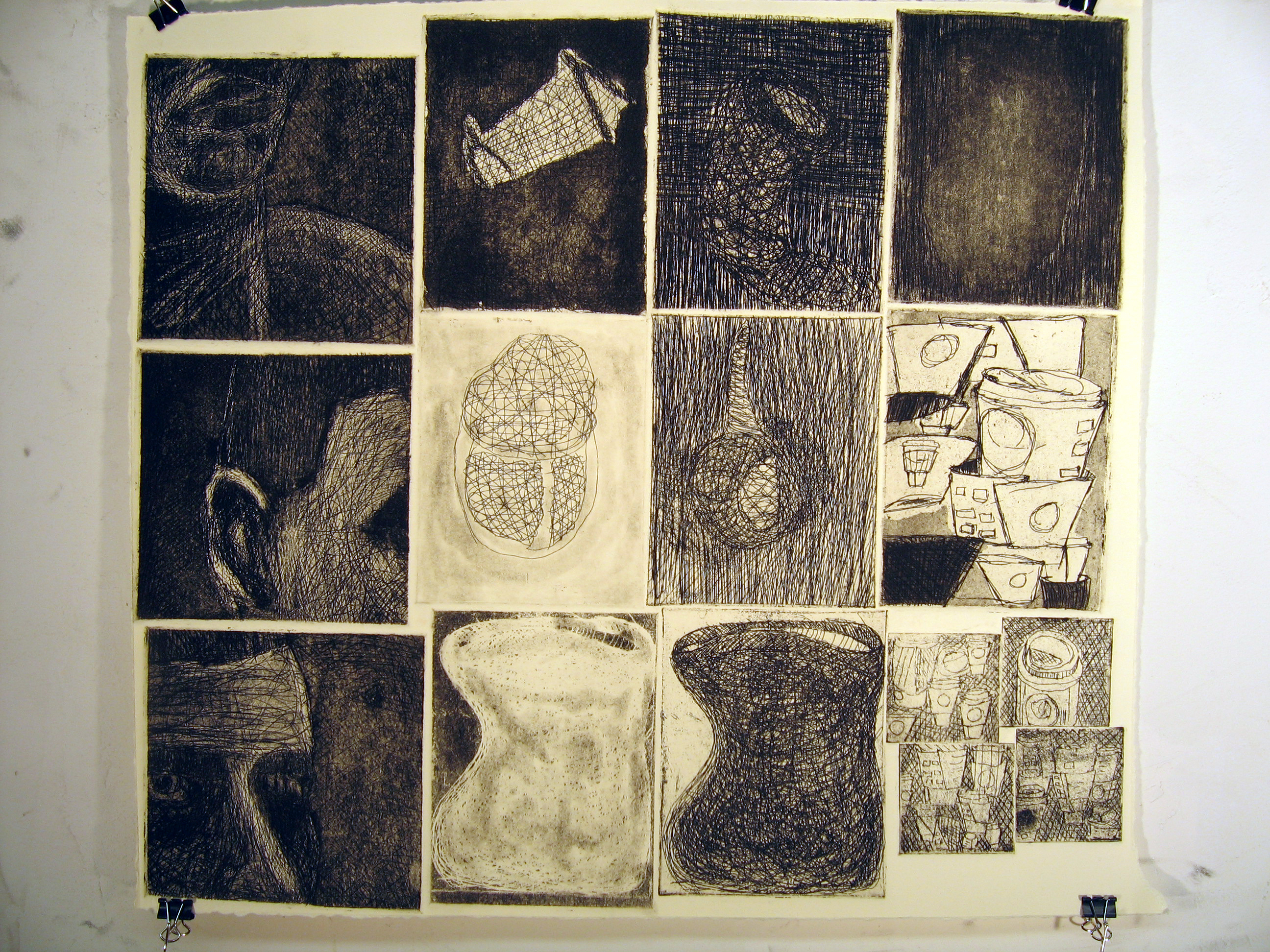 12 proofs for unrealized book of etchings, each image approximately 4"x5", whole sheet, 15"x16"